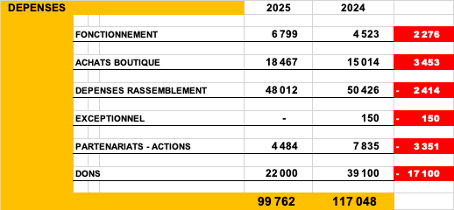 Pour la partie DEPENSES, on peut noter : o Que le poste fonctionnement inclut le coût de la refonte du site pour 2.200 € qui justifie l’écart. Les autres postes ne présentent pas d’écart significatif. o Que les achats boutique + 3.500€ ont permis cette année de revoir la collection textile et d’intégrer de belles nouveautés. o Que les économies du poste dépenses Rassemblement se sont faites principalement sur les dépenses de Marketing (T-shirt et Tombola) et sur l’hébergement o Que le Poste Partenariat Actions inclut les éléments suivants :