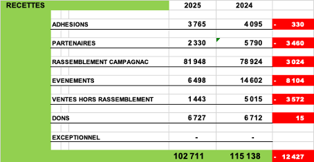 Pour la partie RECETTES, on peut noter : o Que le poste Partenaires subit une baisse très significative. Il a été convenu que l’année 2026 ce poste sera une priorité à travailler par tous nos adhérents en sollicitant leur réseau. o Que le poste Recettes Rassemblement présente une belle progression de 3.500 € grâce aux performances du bar et de la boutique qui compensent les baisses des inscriptions et de la tombola. o Que le poste Évènements inclut en 2024 les recettes de la journée Jules pour 8.200€. Le Tour du Forez 2025 a fait un chiffre de 5.400€ en recettes mais surtout un bénéfice record de 1.500€ grâce à l’organisation et aux négociations de Francine et Thierry DUVAL.